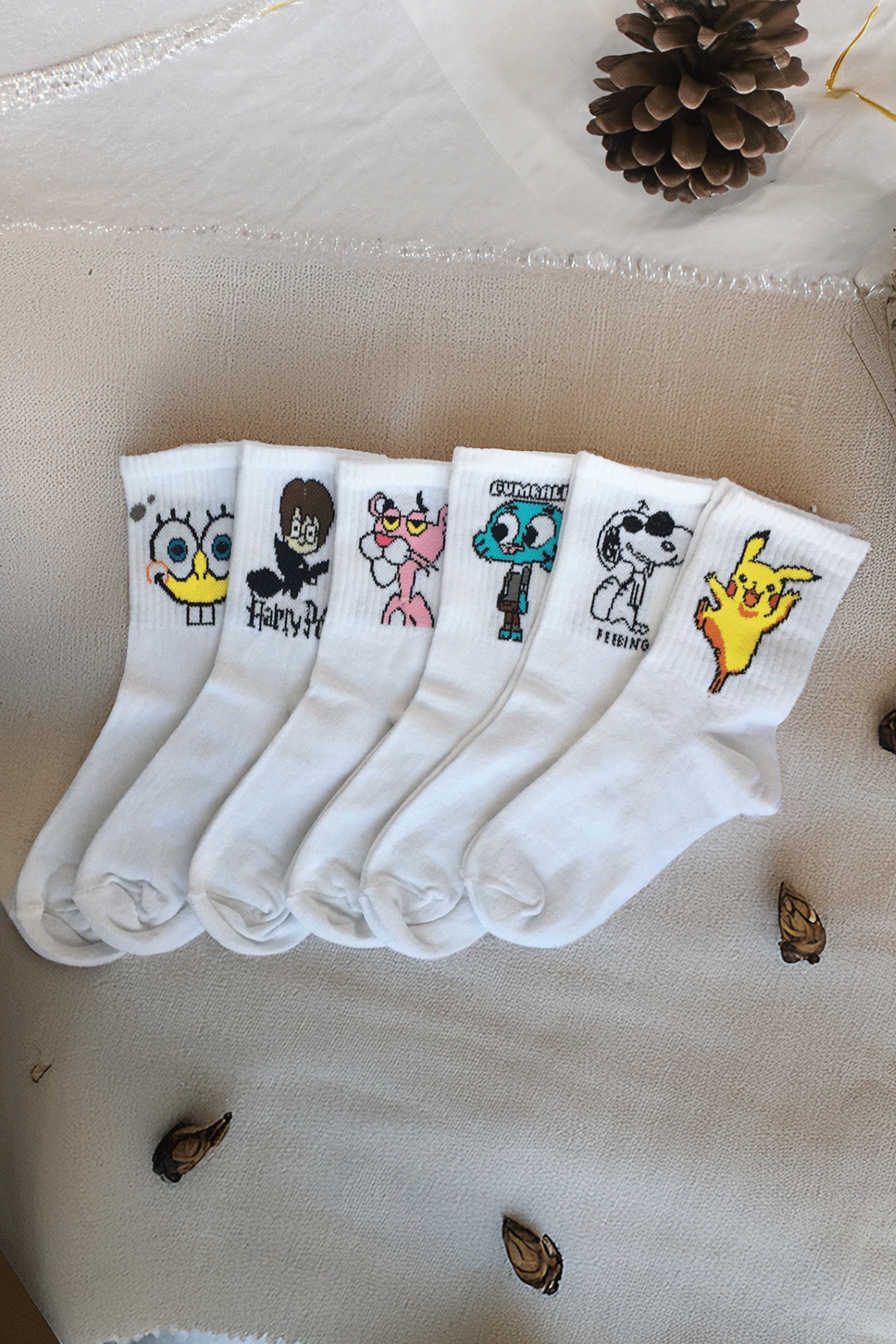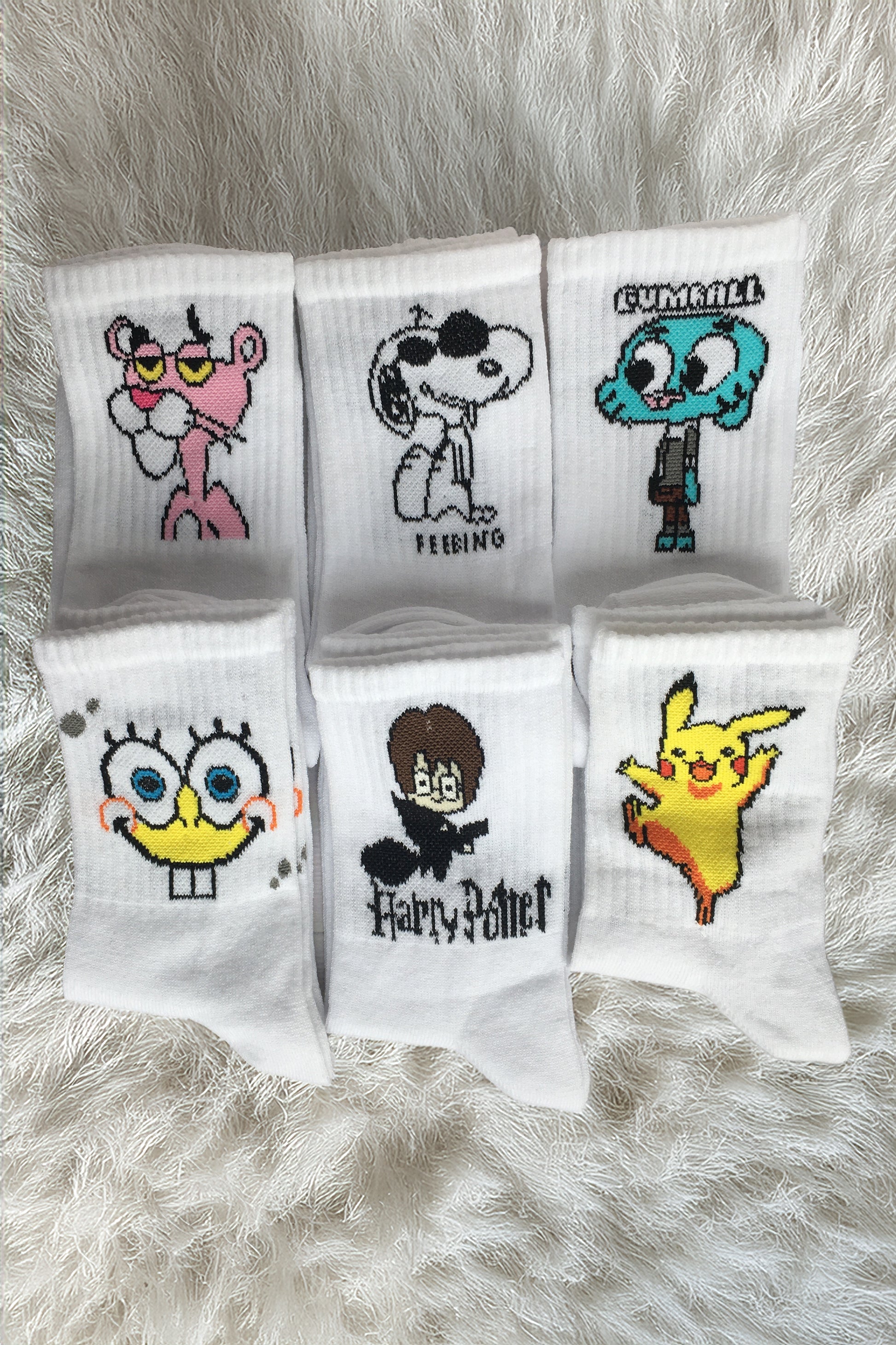 Paket içerisinde 6 çift karışık desenlerden (Gumball, Harry Potter, Sünger Bob, Pembe Panter, Snoopy Dog, Pikachu) oluşan çorap vardır.