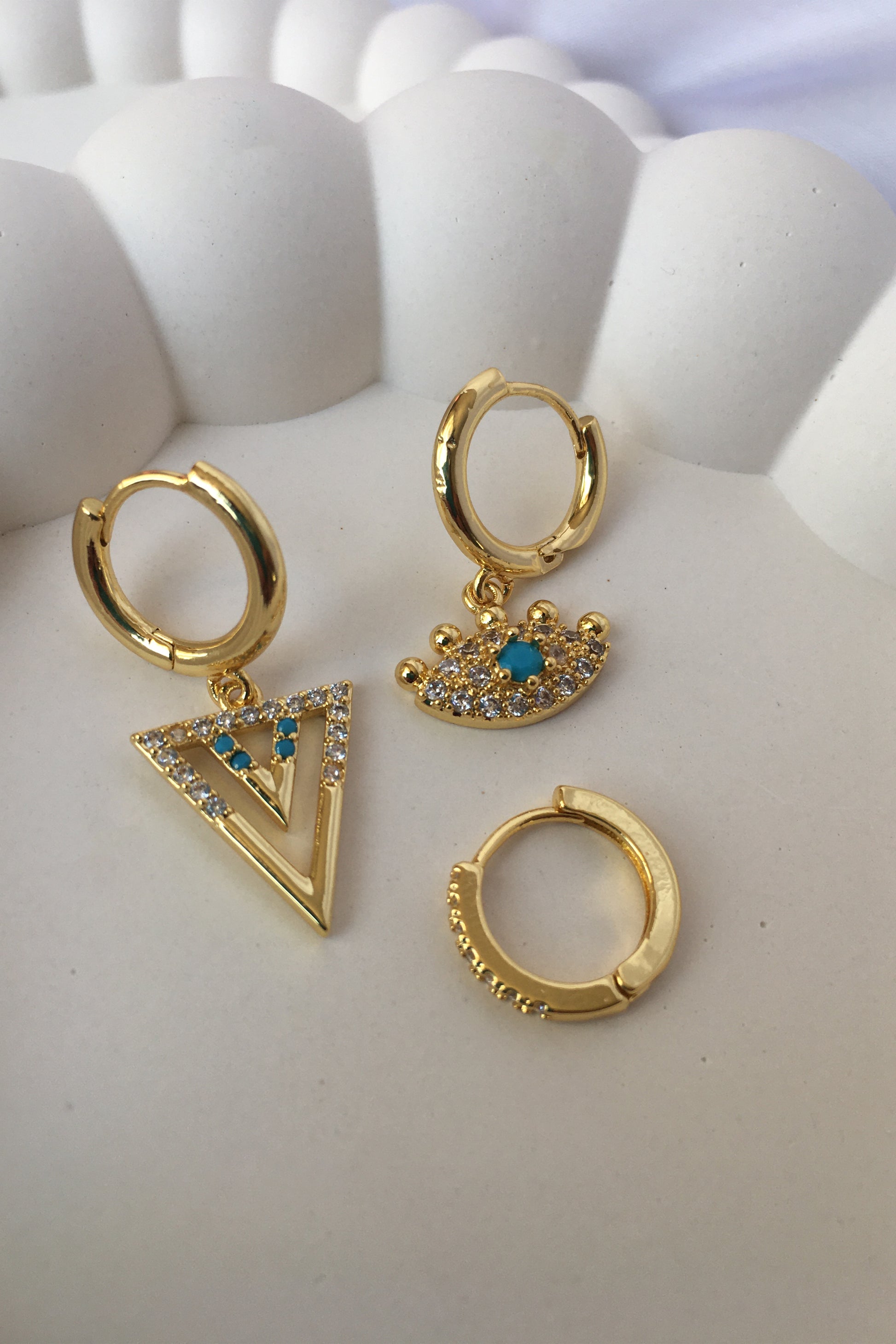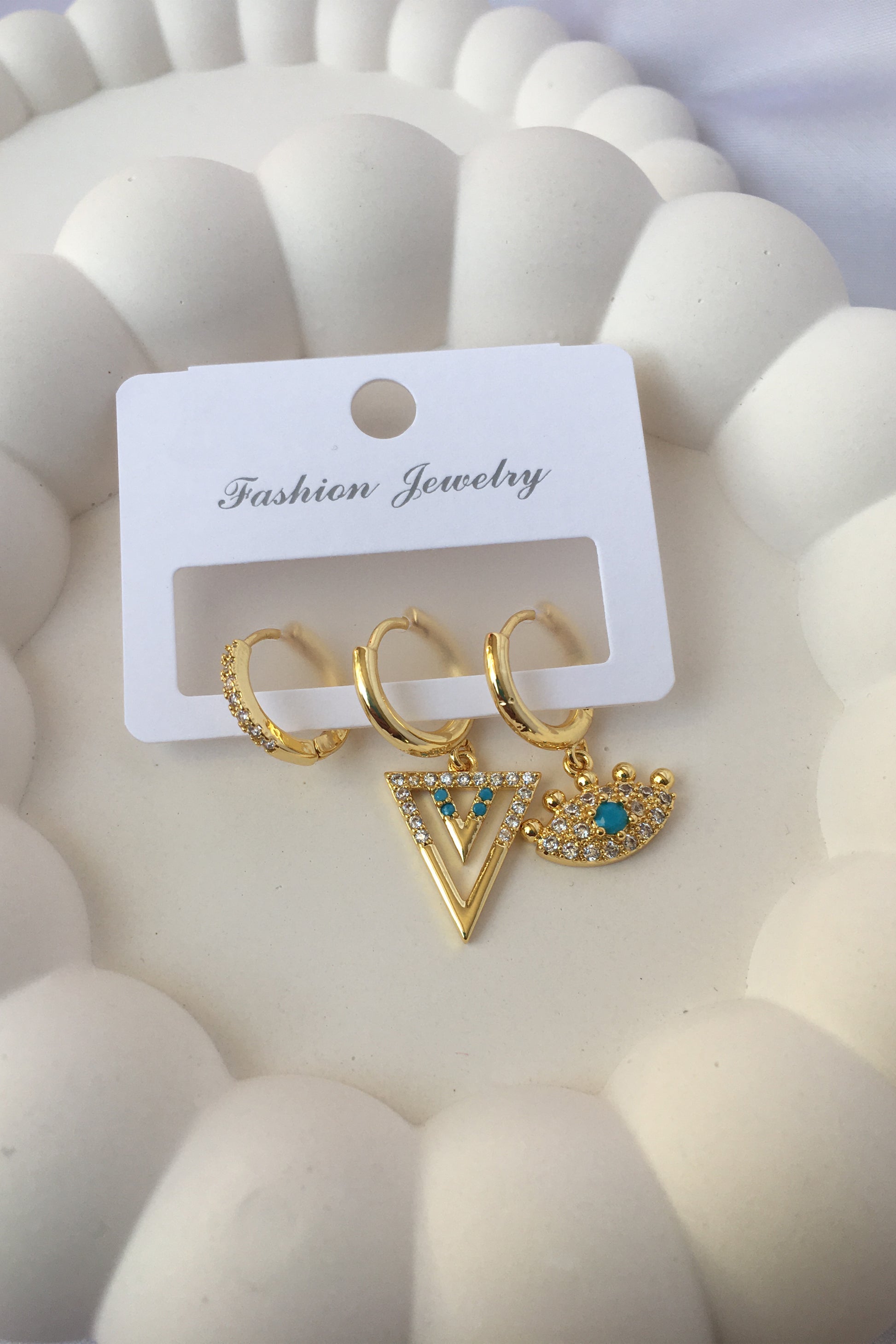 Çelik Gold 3’lü Küpe Seti Kirpikli Göz Detaylı Küpe Üçgen Küpe Zirkon Taşlı Küpe