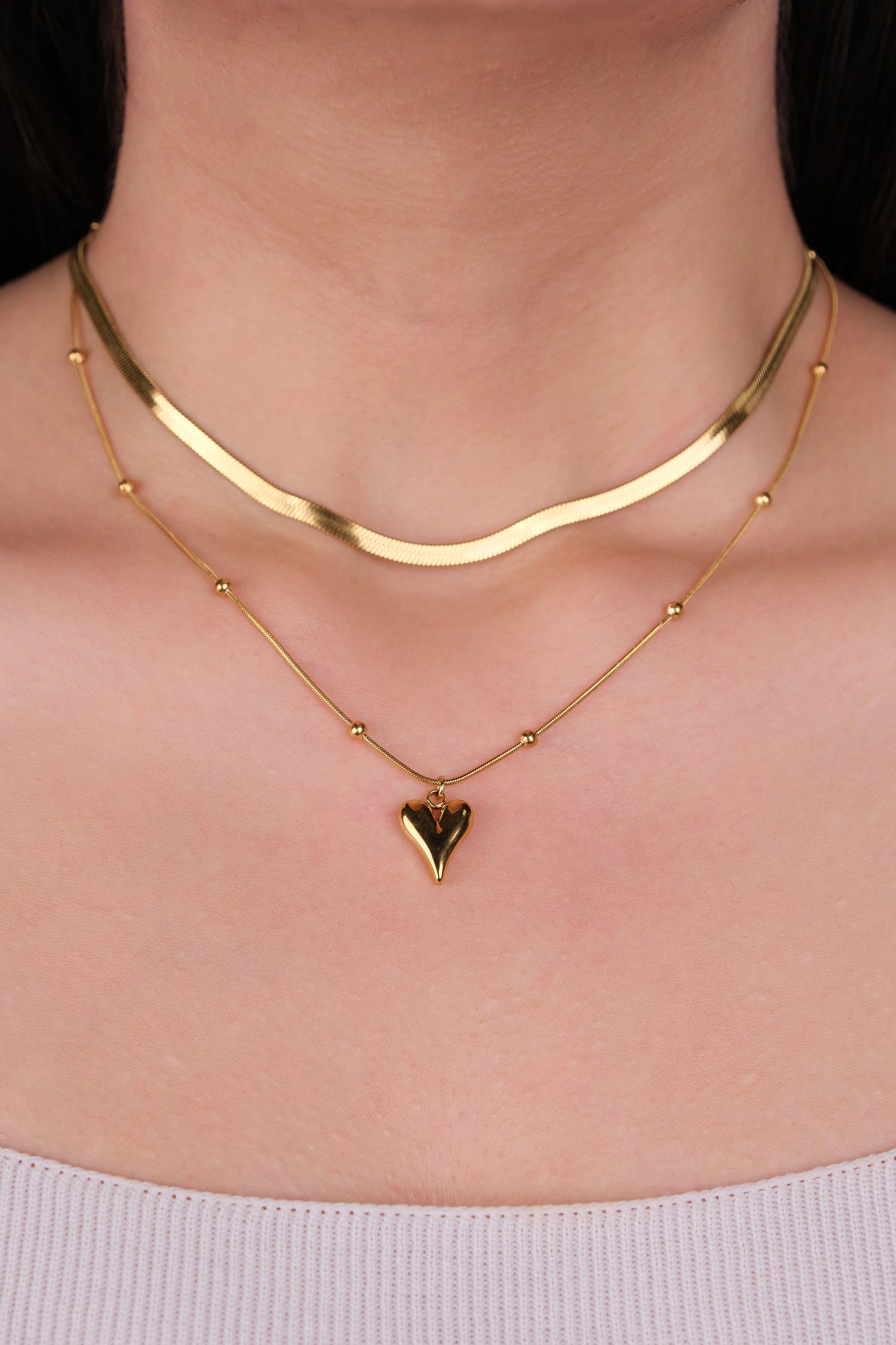Paslanmaz Çelik 2’li Kolye Seti Dorika Zincirli Kalp Model- Italyan Zincir 45 cm Gold Kaplama Kolye