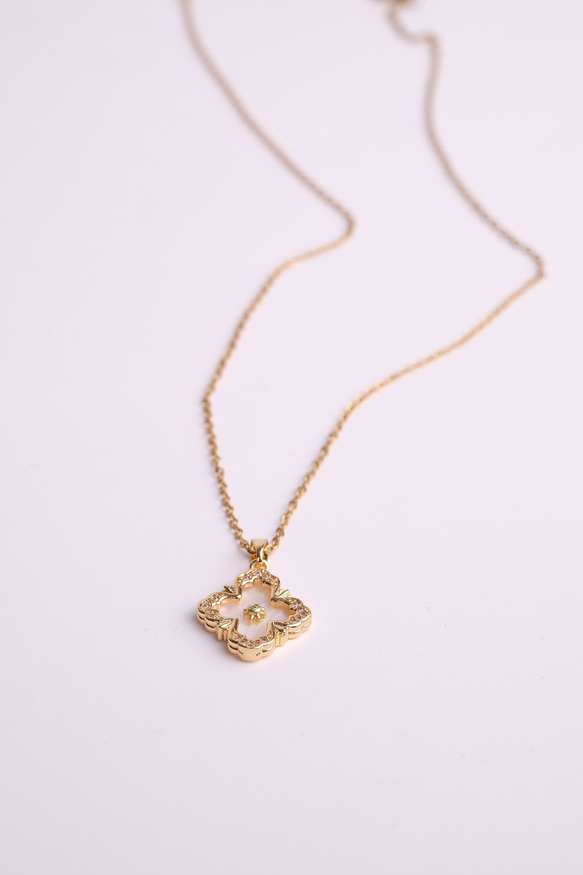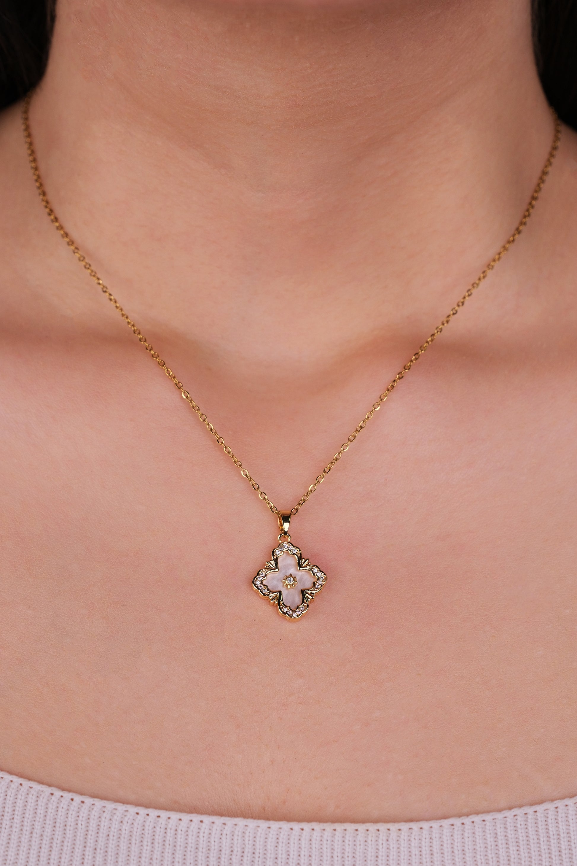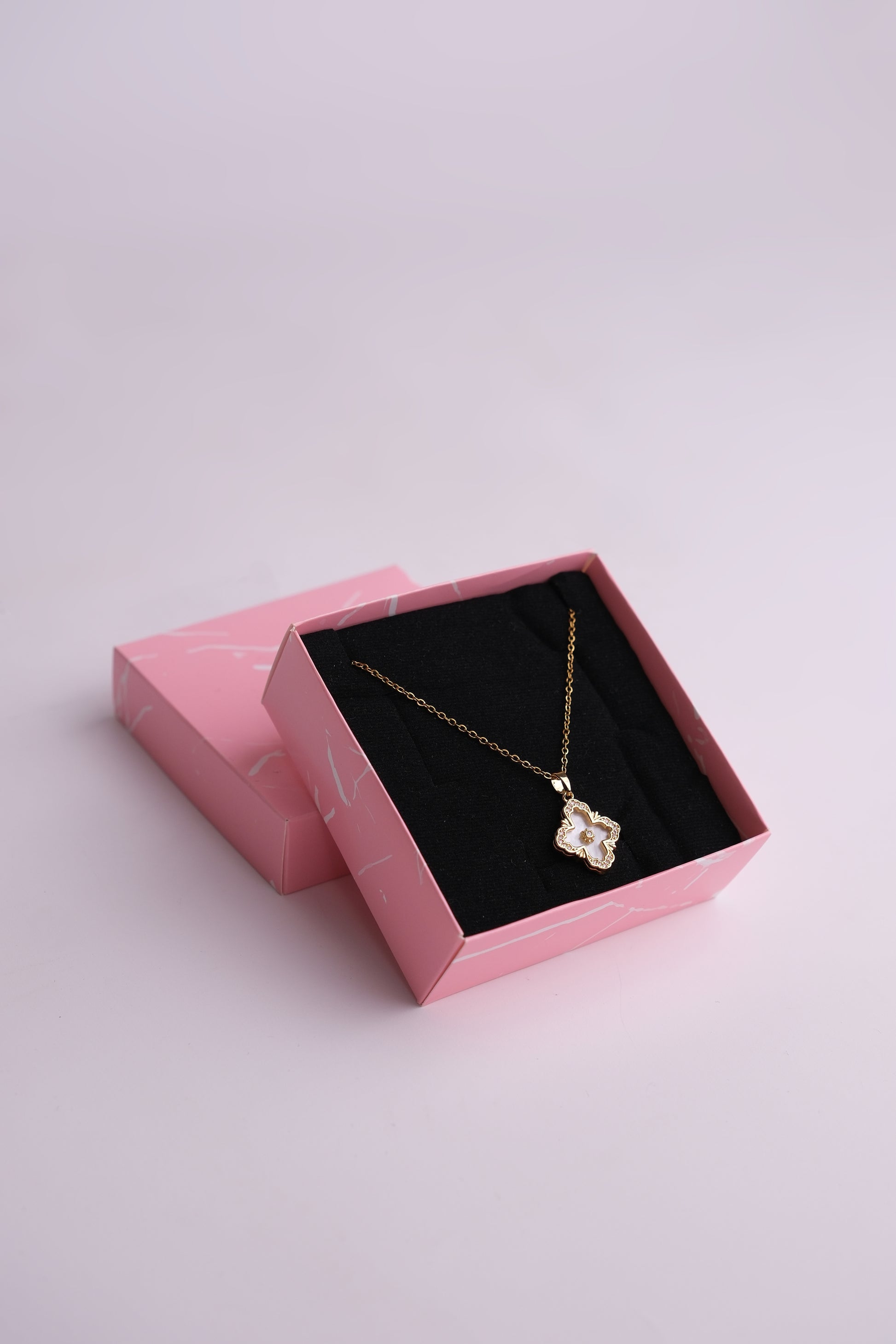 Çelik Beyaz Sedef Taşlı Van Cleef Kolye, Çelik Gold Kolye, Kararmaz Çelik Van Cleef Kolye, Çelik Beyaz Sedef Gold Kolye