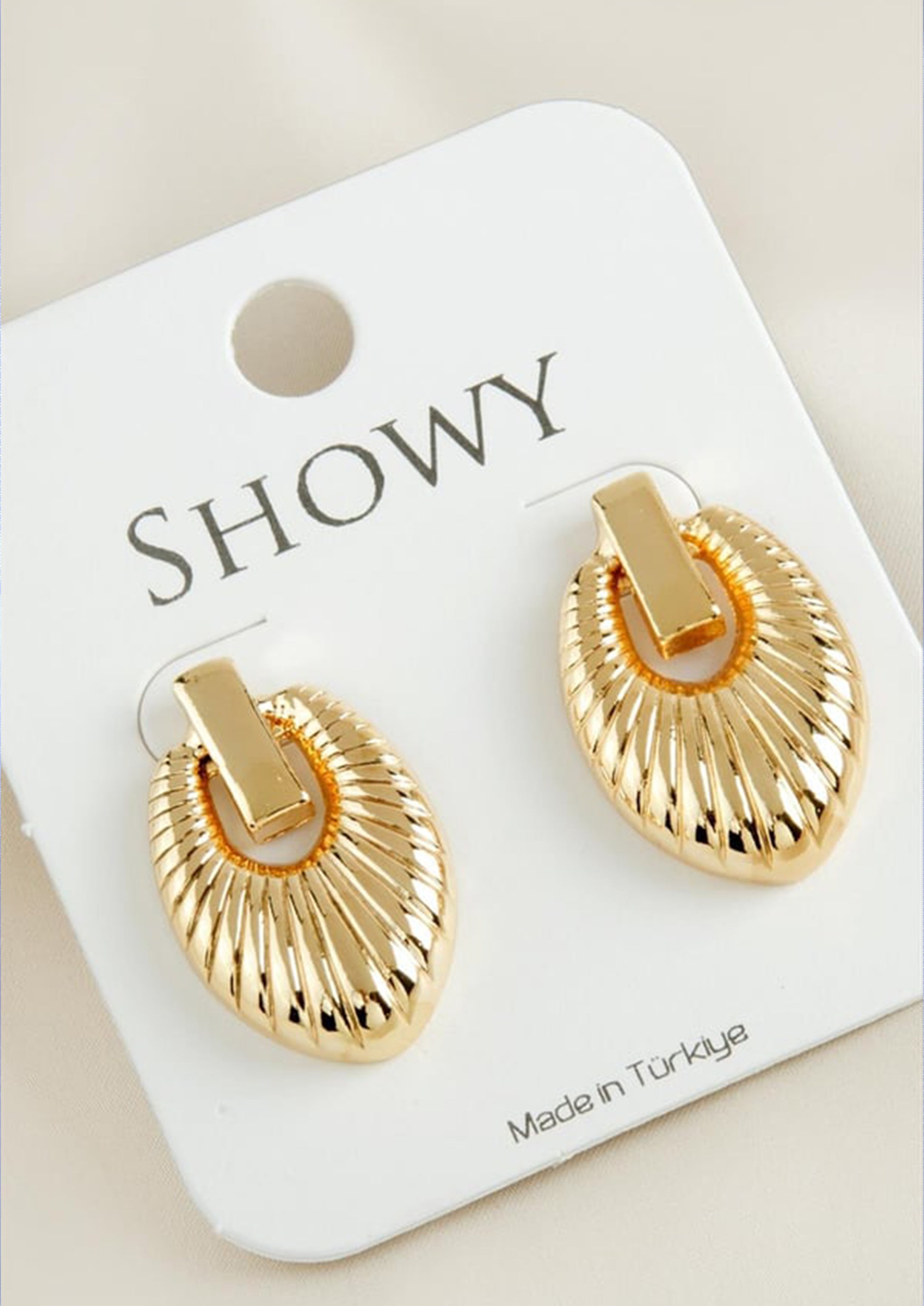 - Oval Küpe, Gold Kaplama Badem Model Küpe, Çizgili Oval Küpe
