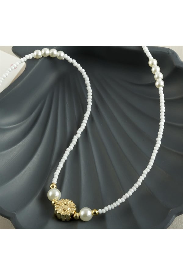 - İnci Kolye, Beyaz Kum Boncuk Kolye, Gold Kaplama Çiçek Kolye