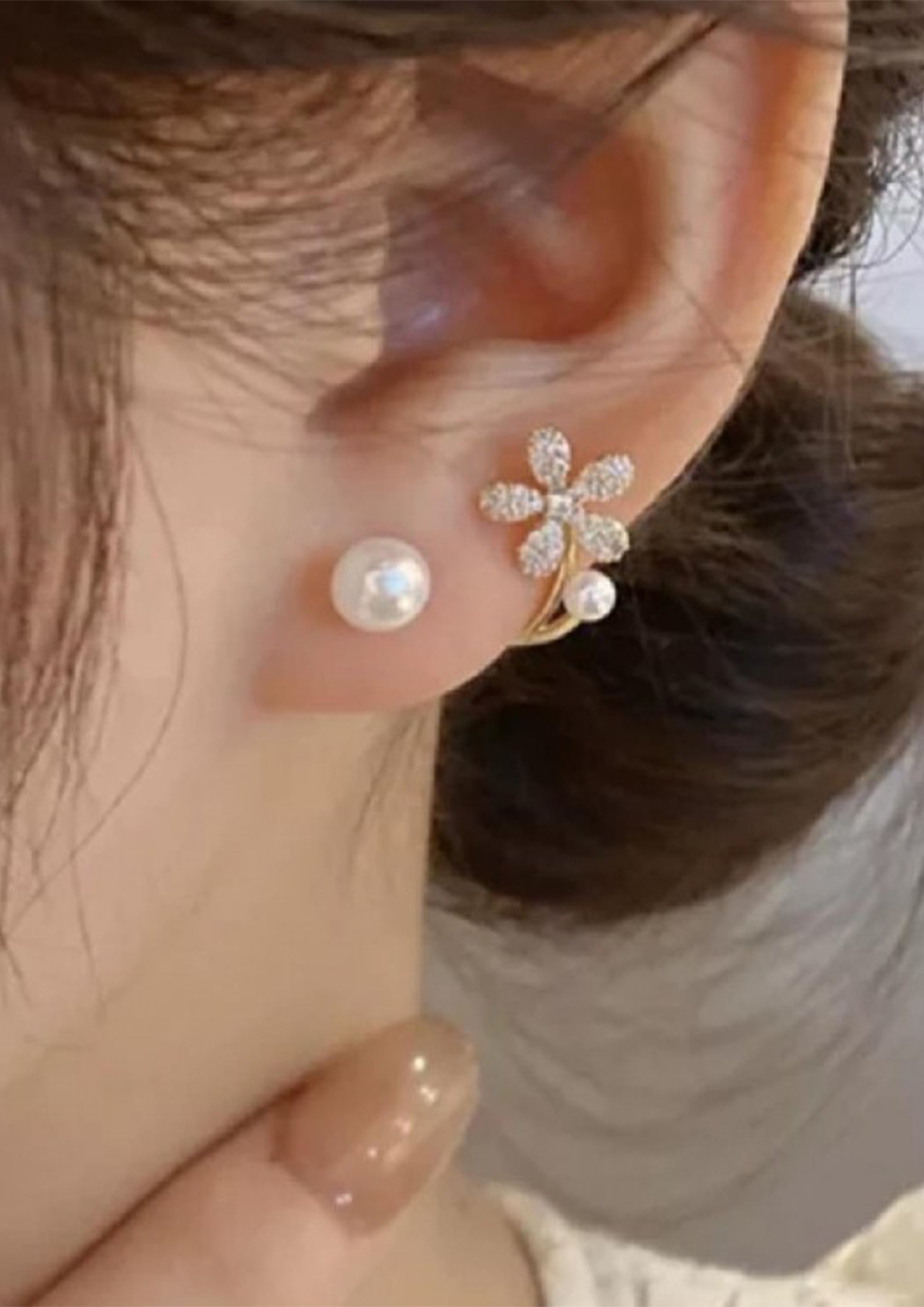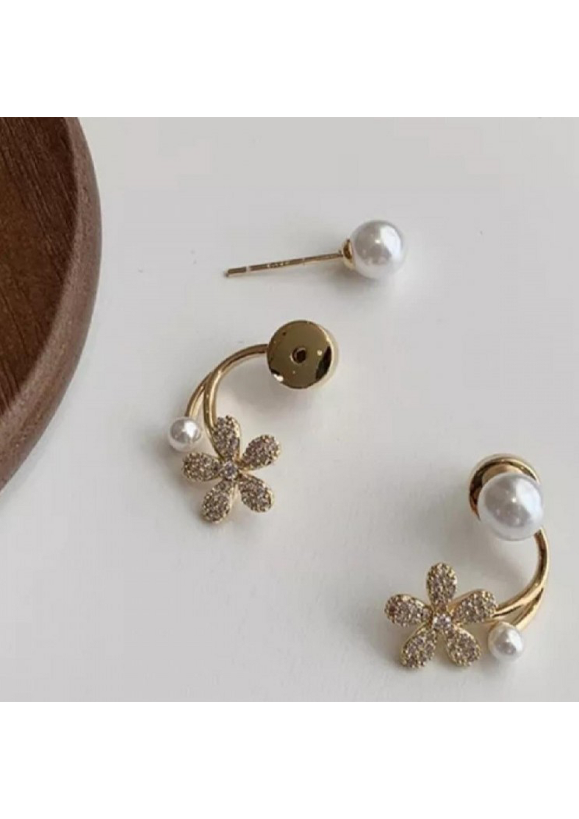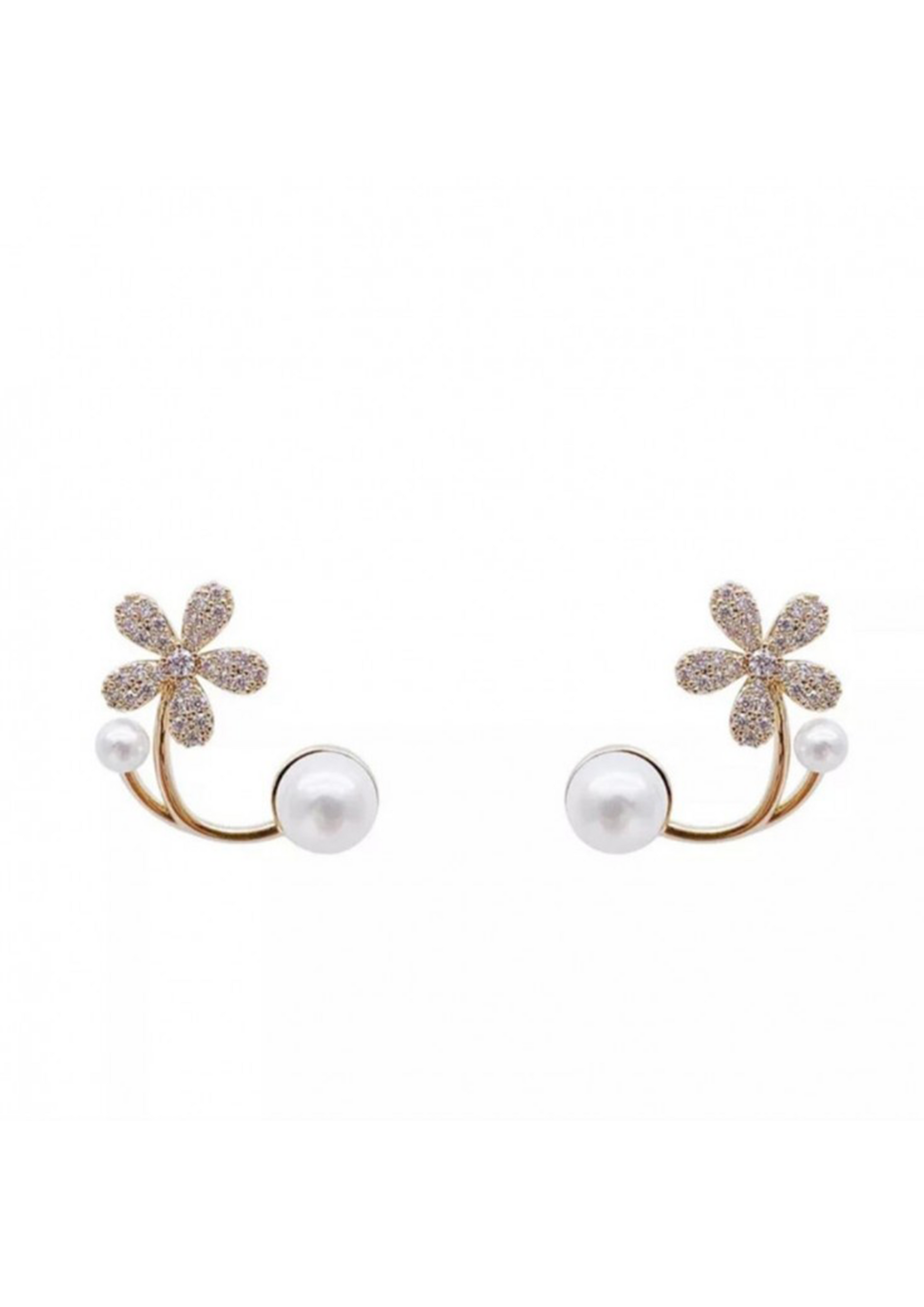 PERLİSS Kararmaz Çelik Zirkon Taşlı Çiçek Model Gold Küpe, İnci Detaylı Çiçek Küpe