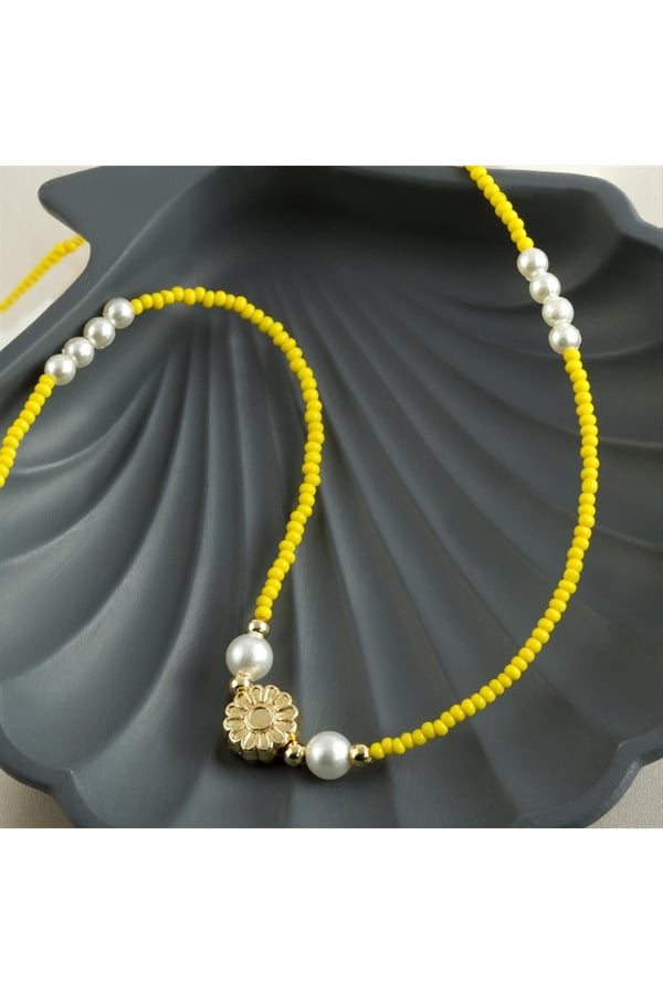 - İnci Kolye, Sarı Kum Boncuk Kolye, Gold Kaplama Çiçek Kolye